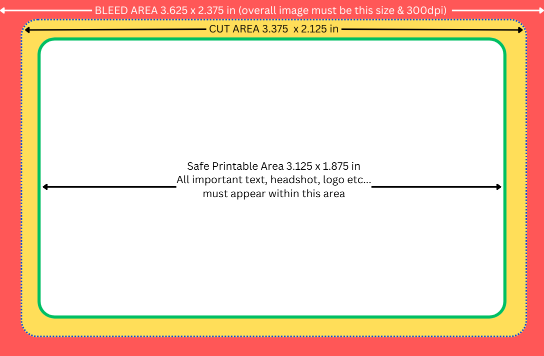 Any important text or design elements within this area, which isn't much smaller than the actual size of the card (Cut Area), should be kept inside this box to ensure that nothing gets cut off.